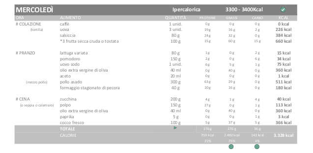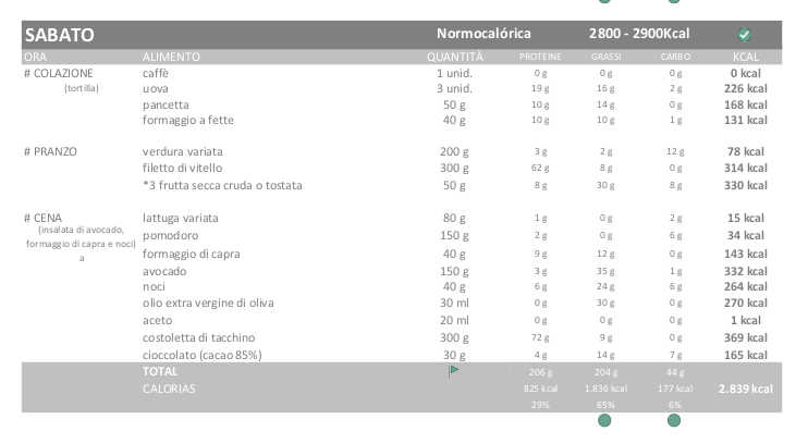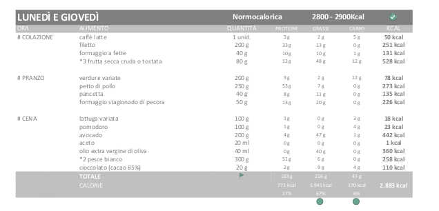 Inizio con una dieta non molto elevata, circa 3300kcal nei giorni ipercalorici che sono quelli in cui mi alleno, e la normalocalorica di circa 2900kcal nel resto dei giorni . Come ho già detto questo sarà il minimo, e anche se normalmente non si ha fame seguendo una dieta keto, porterò sempre con me cibi che posso mangiare ovunque.