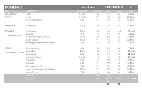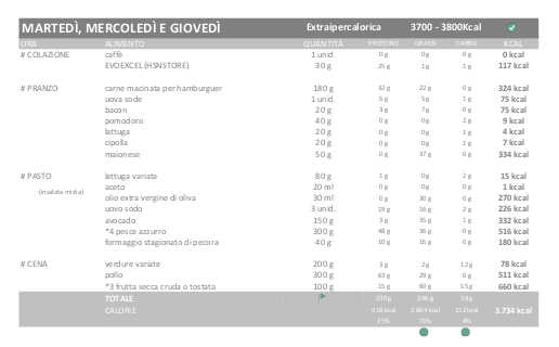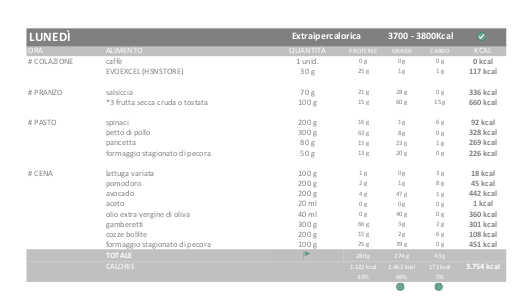 Pertanto i giorni di dieta Ipercalorica (115%) saranno di 3.300-3.400 kcal e i giorni di EXTRA Ipercalorica (130%) saranno di 3.700 – 3.800 kcal.