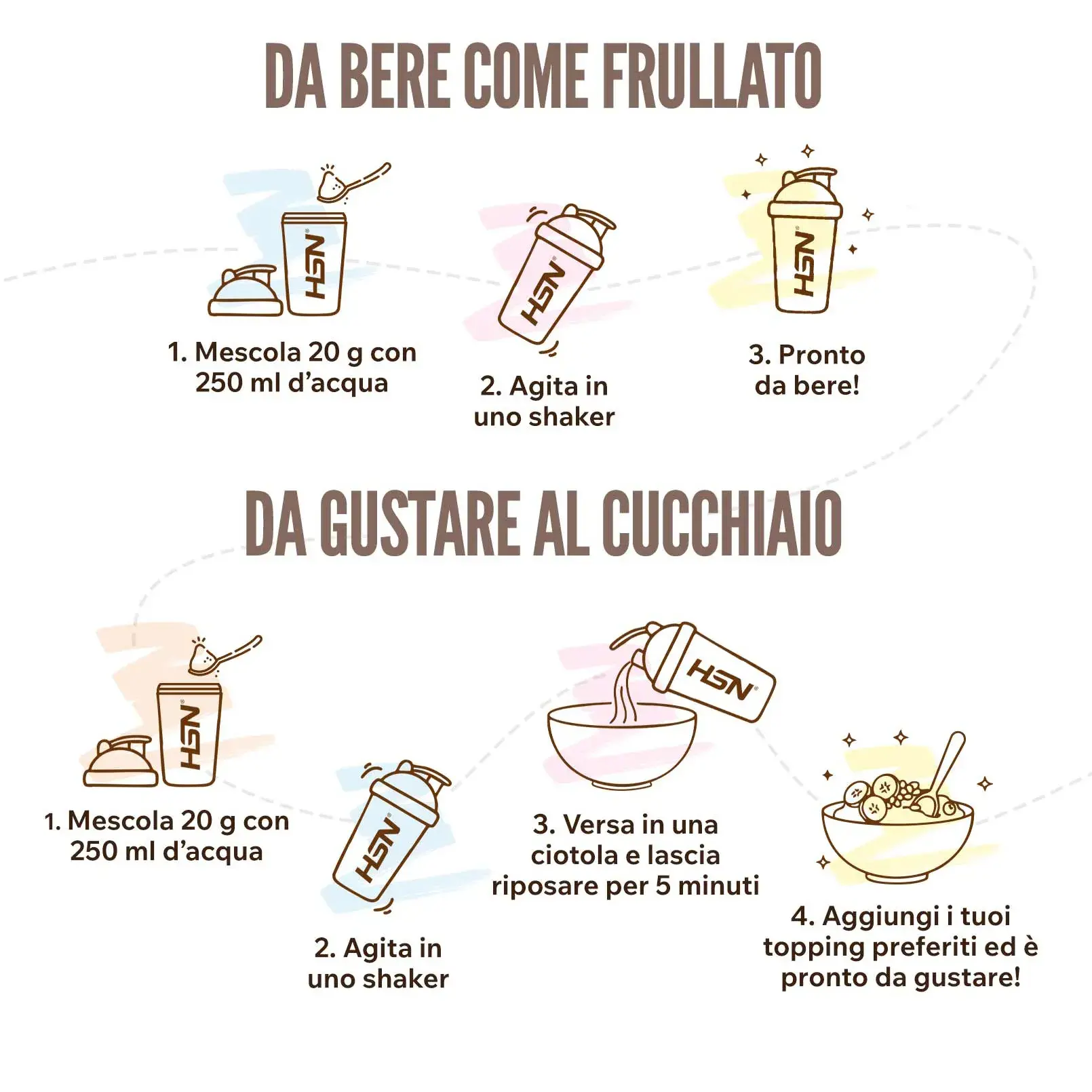 Questa preparazione proteica è una formula esclusiva di HSN pensata per migliorare l’alimentazione, che utilizza proteina isolata di soia, oltre a glucomannano e inulina.