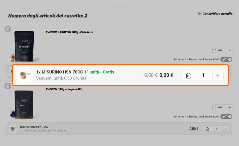 Un esempio pratico: come mostrato nell’immagine, nel carrello è stata aggiunta una busta da 500 g di Evowhey Protein, per cui è necessario un misurino da 70 ml. È stata aggiunta anche una busta da 150 g di Evofuel, selezionando l’opzione per il misurino (delle stesse dimensioni di quello per Evowhey Protein). Il primo misurino è gratuito, il secondo ha un costo di 0,50 €. *Consiglio: puoi usare un unico misurino dosatore per entrambi i prodotti, poiché la dose consigliata di Evowhey Protein e Evofuel è di 70 ml.