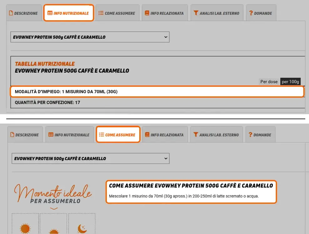- Una volta dentro, vai alla sezione "Info nutrizionale", dove è indicata la dimensione della dose consigliata.