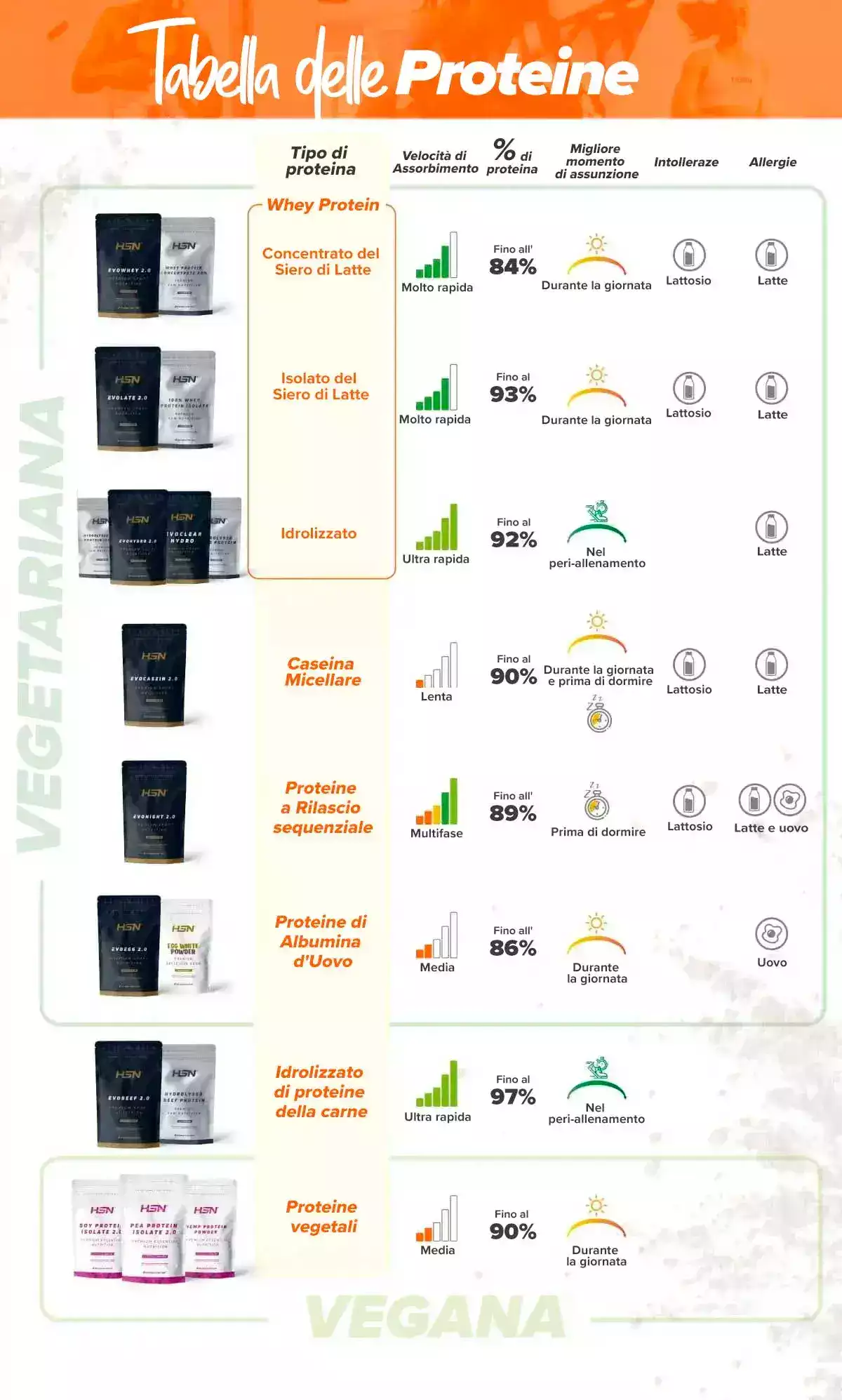 Benvenuti nella nostra guida alla scelta delle proteine. Questa tabella è stata pensata per aiutarvi a trovare la proteina giusta in base alla velocità di assorbimento, alla percentuale di proteine, al momento dell'assunzione, alle intolleranze e alle specificità alimentari.